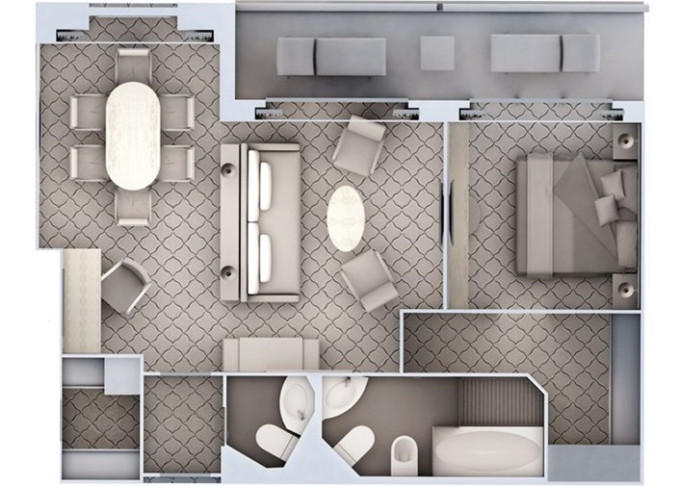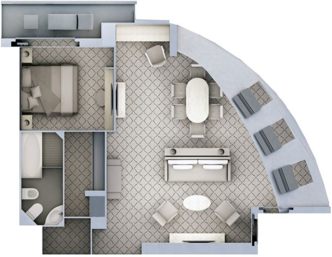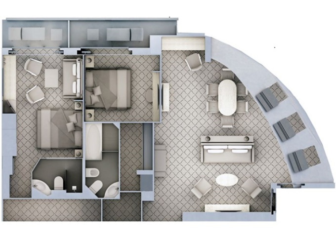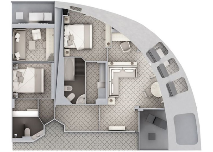 | R2 - Royal Suite 2 79,5 m² + balkóny 16,5 m. Royal Suite R1 spojená s Veranda Suite. 6. paluba - vpredu. Max 5 osôb. | 94 400 € 94 400 € za osobu |