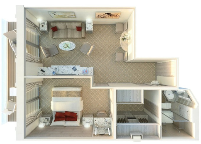 | R2 - Royal Suite 2 79,5 m² + balkóny 16,5 m. Royal Suite R1 spojená s Veranda Suite. 6. paluba - vpredu. Max 5 osôb. | 94 400 € 47 200 € za osobu |