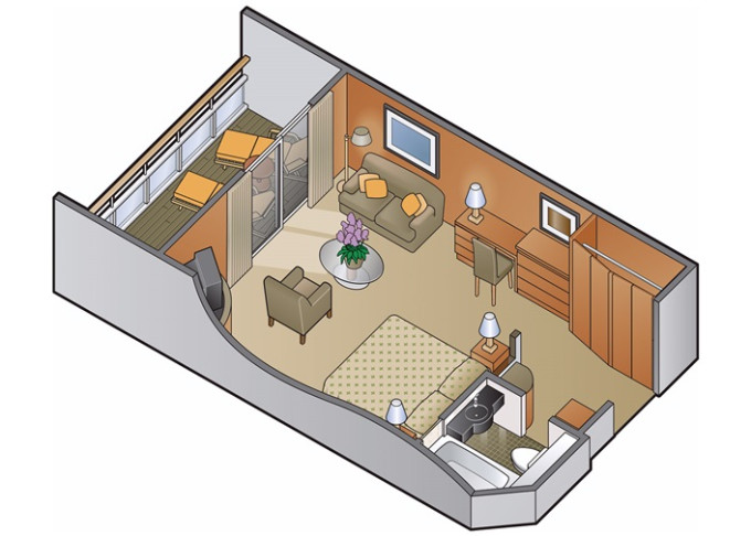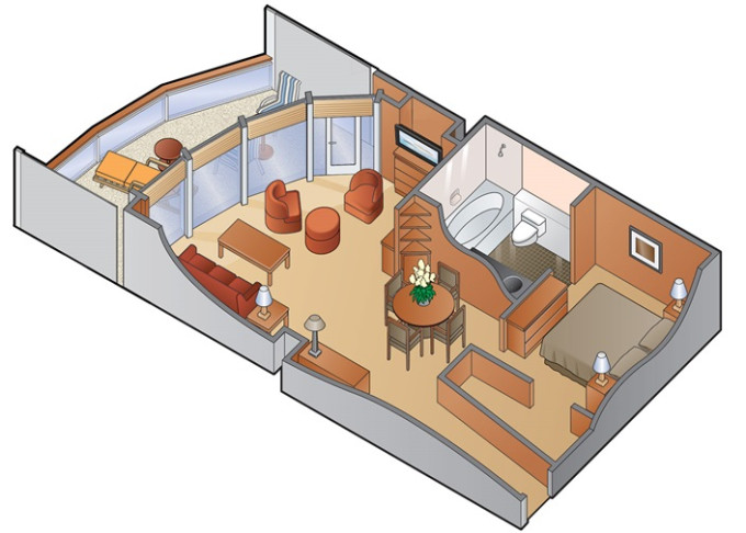 | CS - Celebrity Suite 44 m² + balkón 8 m². Kúpeľňa s vírivkou. 6. až 9. paluba. Max 3 osoby. Výhody Suite The Retreat. | 17 132 € 8 566 € za osobu | ||