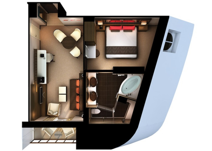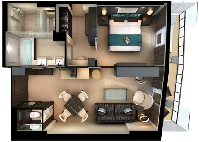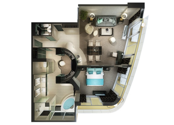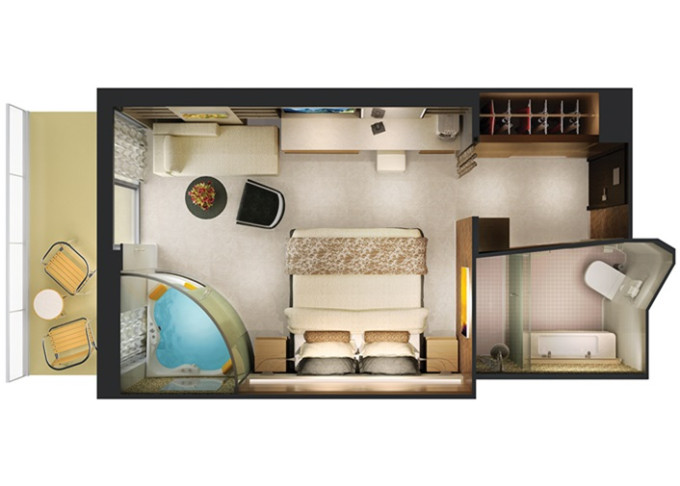 | H3 - The Haven Deluxe Owner's Suite 53 m² / balkón 9 m². 16. paluba - vpredu. Max 4 osoby. Výhody The Haven. | 19 110 € 9 555 € za osobu |