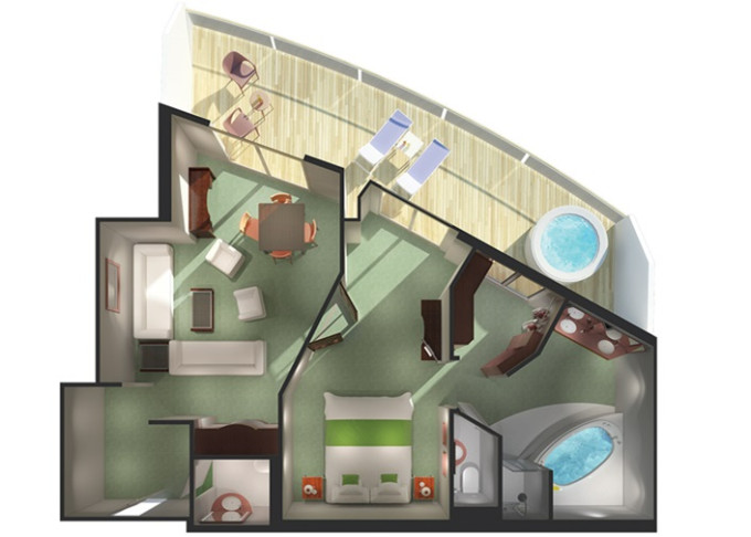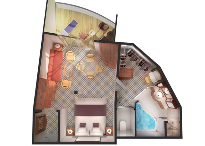 | SF - Aft-facing Penthouse Suite 44-45 m² / balkón 10-11 m². Vírivka. 8. až 10. paluba - vzadu. Max 4 osoby. Výhody Suite. | 15 798 € 7 899 € za osobu |