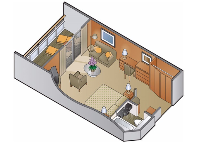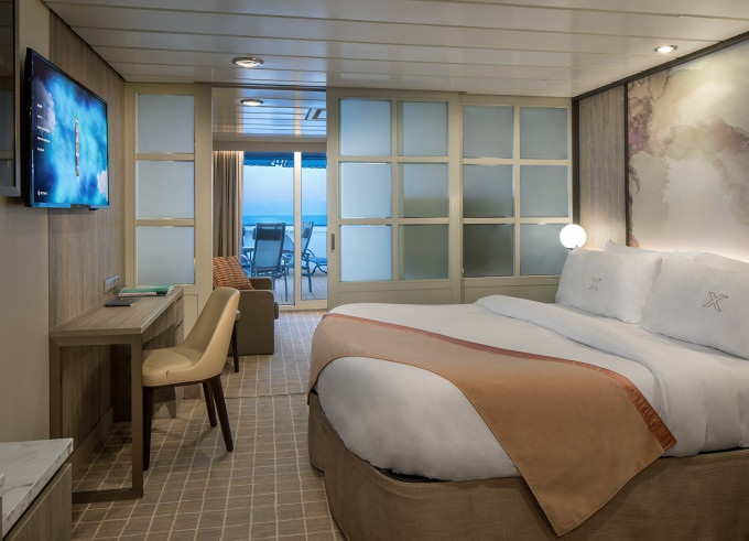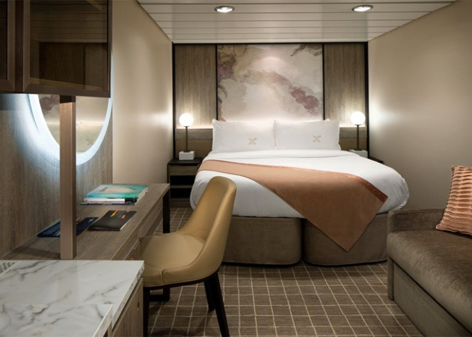 • Kajuty sú umiestnené v blízkosti lodného Spa. K ich vybaveniu patrí posilnený systém vzdušnej filtrácie, posteľ Queen-Size (v kategóriách Edge King-Size), veľké zasúvacie sklenené dvere, exkluzívne posteľné prádlo eXhale®, veľkorysé skladovacie priestory.