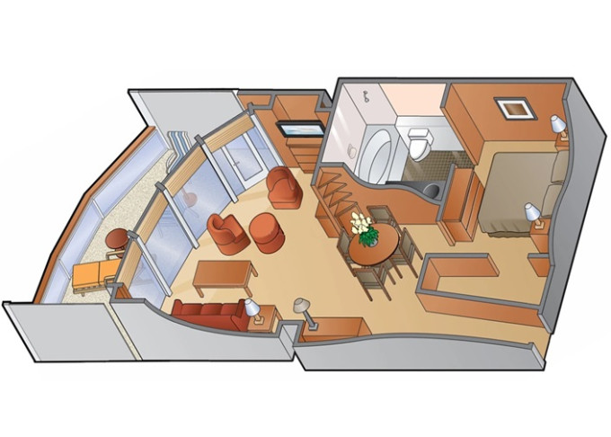CS - Celebrity Suite 43 m² + balkón 8 m². Kúpeľňa s vírivkou. 6. až 9. paluba stred. Max 3 osoby. Výhody Suite The Retreat. 16 379 € 16 379 € za osobu