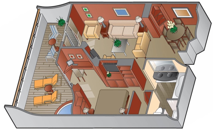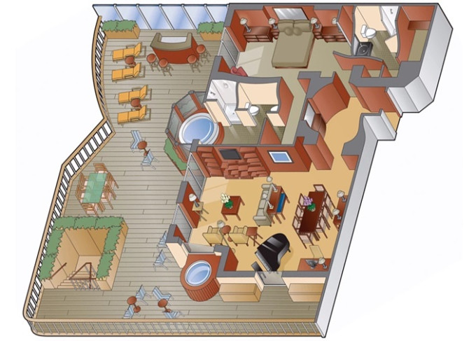 RS - Royal Suite 50 m² + balkón s vírivkou 18 m². Kúpeľňa s vírivkou. 6. paluba vzadu. Max 4 osoby. Výhody Suite The Retreat. 18 801 € 18 801 € za osobu