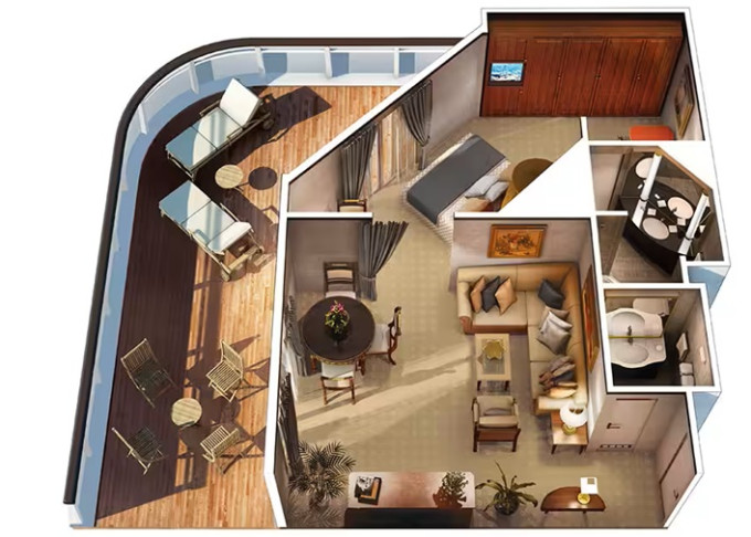 | OS - Owner’s Suite 123 m² + balkón s vírivkou od 62 m². 8. až 10. paluba vzadu. Max 2-3 osoby. 4 izby: vstupná hala s pianom, spálňa, veľká obývacia miestnosť s jedálenskou časťou, 2 kúpeľne (1 s vírivkou), 2 šatníky. Výhody Owners Suite. | 32 458 € 16 229 € za osobu |