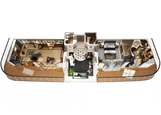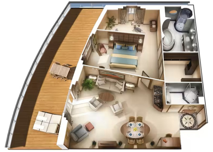 | OS - Owner’s Suite 123 m² + balkón od 62 m². 8. až 10. paluba vzadu. Max 2-3 osoby. 4 izby: vstupná hala s pianom, spálňa, veľká obývacia miestnosť s jedálenskou časťou, 2 kúpeľne (1 s vírivkou), 2 šatníky. Výhody Owners Suite. | 45 298 € 22 649 € za osobu |
