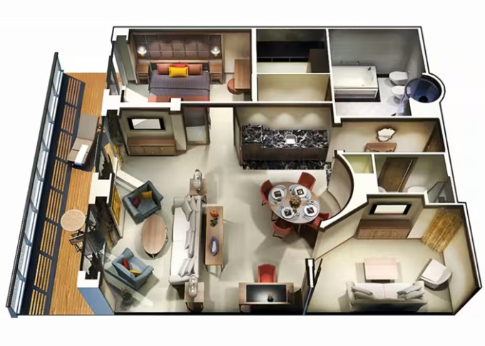 | VS - Vista Suite od 87 m² + balkón od 24 m². 8. až 10. paluba. Max 2-3 osoby. 3 izby: spálňa, veľká obývacia miestnosť s jedálenskou časťou, zariadená fitness miestnosť, 2 kúpeľne (1 s vírivkou), šatník. Výhody Vista Suite. | 38 478 € 19 239 € za osobu |