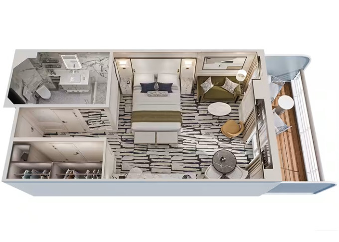 | A4 - Kajuta s balkónom Concierge 23 m² + balkón 4 m². 9. paluba vpredu, vzadu. Max 2-3 osoby. Výhody kategórie Concierge. | 16 258 € 8 129 € za osobu |