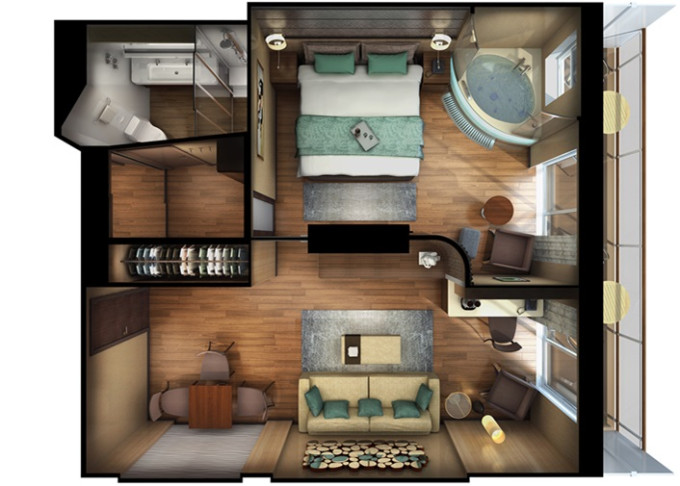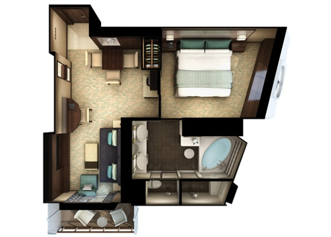 | H3 - The Haven Deluxe Owner's Suite 53 m² / balkón 8 m². 17,18. paluba - vpredu. Max 4 osoby. Výhody The Haven. | 9 800 € 4 900 € za osobu |