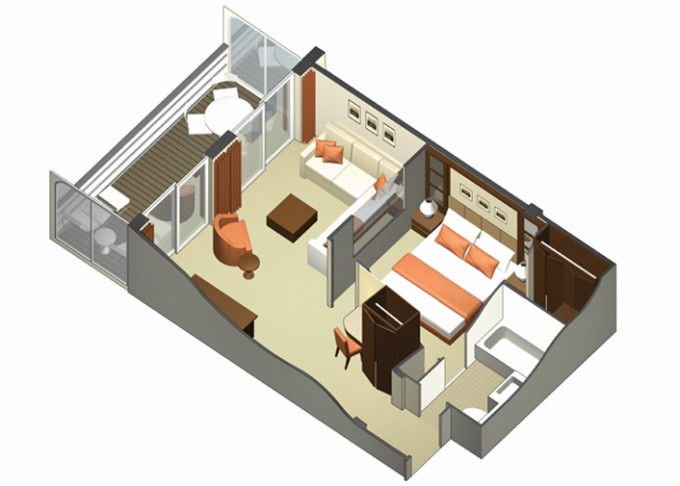 • Kajuty sú umiestnené v blízkosti lodného Spa. K ich vybaveniu patrí posilnený systém vzdušnej filtrácie, posteľ Queen-Size (v kategóriách Edge King-Size), veľké zasúvacie sklenené dvere, exkluzívne posteľné prádlo eXhale®, veľkorysé skladovacie priestory.