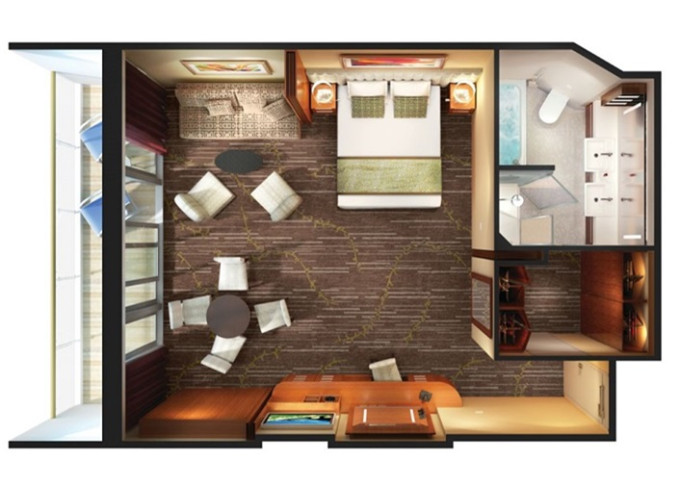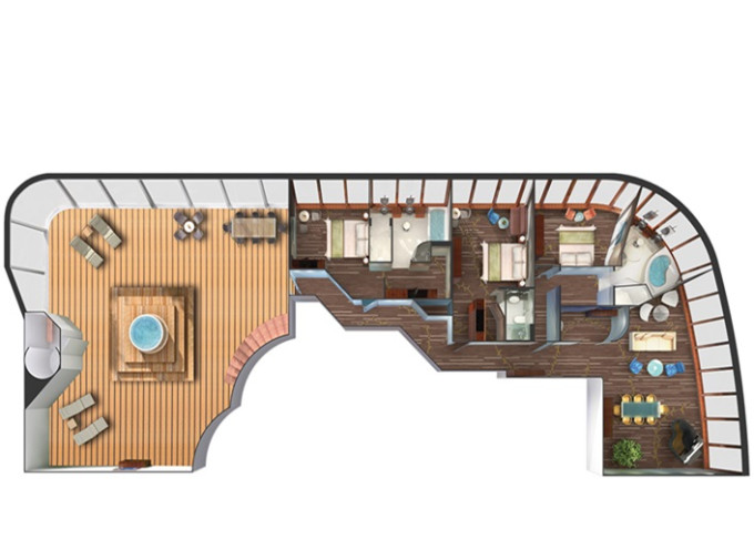 | S6 - Deluxe Owner's Suite 61-68 m². Celoplošné neotvárateľné okná. 12. paluba - vpredu. Max 4-6 osôb. Výhody Suite. | 4 312 € 2 156 € za osobu | ||