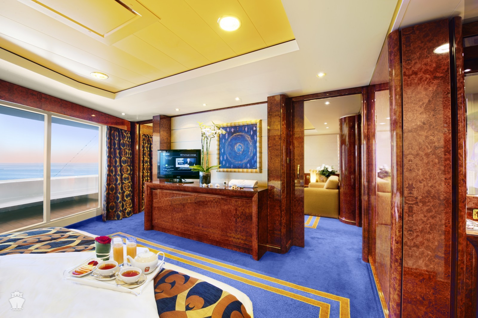 Suite s balkónom/panoramatickým oknom: cca32m²(Royal suite: 52m², Family suite: 45-53m², Deluxe Suite: 32-39m², Aurea suite: 21-47m²), kajuta s manželskou posteľou (na požiadanie 2 oddelené postele) a rozkladacia pohovka. Klimatizácia, kúpeľňa s vaňou, toaletný stolík, priestorná skriňa, interaktívna TV, telefón, minibar, sejf, sušič na vlasy. Balkón so stolíkom a stoličkami/panoramatickým oknom. Internetové pripojenie (za poplatok).