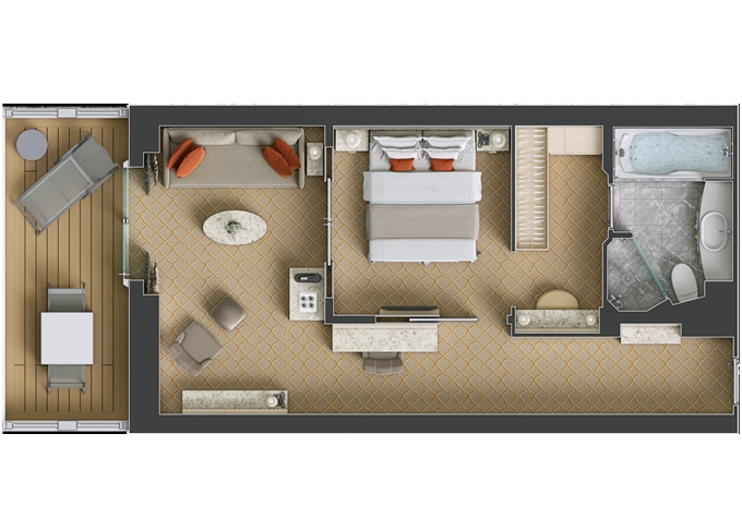 | DX - Deluxe Veranda Suite 30 m² + balkón 6 m². 6,7,8. paluba - stred. Max 3 osoby. | 13 800 € 13 800 € za osobu | ||