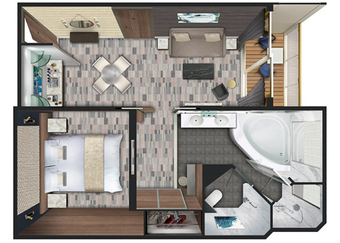 | SB - Aft-facing Owners Suite 56 m² / balkón 6 m². Vírivka. 9. paluba - vzadu. Max 2 osoby. Výhody Suite. | 36 794 € 18 397 € za osobu | ||