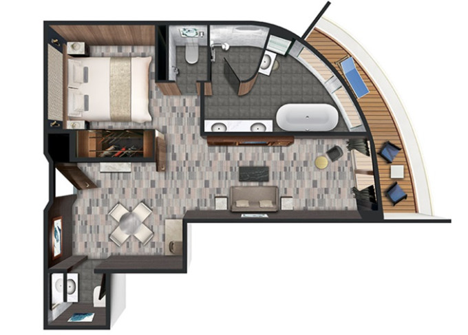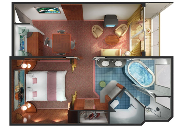 | SC - Forward-facing Deluxe Penthouse Suite 51 m² / balkón 10 m². Vírivka. 10. paluba - vpredu. Max 3 osoby. Výhody Suite. | 29 174 € 14 587 € za osobu | ||